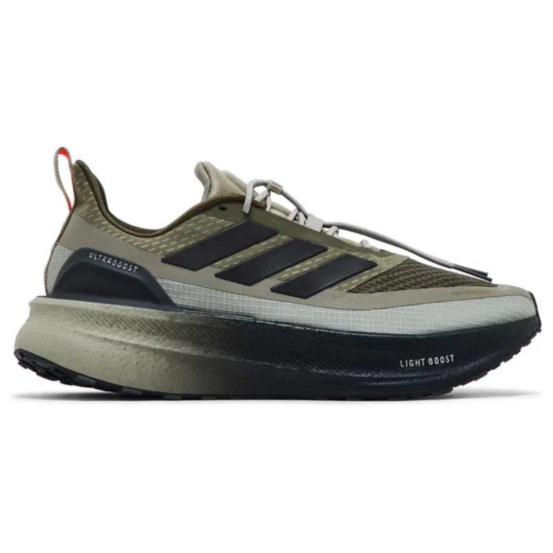 O adidas Ultraboost 5 TR Silver Pebble combina cabedal em têxtil e sintético com tecnologia de isolamento Climawarm, estrutura tipo meia e reforços em áreas de maior desgaste, faixa lateral com as três listras em preto integradas ao suporte do mediopé, sistema de cadarço rápido que facilita o ajuste mesmo em dias frios, entressola em espuma Light Boost de peça única com amortecimento macio e responsivo e solado em borracha Continental com cravos para aderência em piso molhado e terrenos mistos. Assinatura visual: cabedal e entressola em tom cinza-esverdeado Silver Pebble, três listras em preto (Core Black) e toques de laranja intenso (Impact Orange) na aba traseira e na sola, com visual robusto de corrida em clima frio. Colorway também conhecida como “Silver Pebble / Core Black / Impact Orange” (cinza-esverdeado com detalhes preto e laranja na aba traseira).